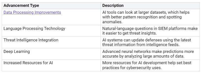 Recent tech improvements have led to more AI in cybersecurity. The table below shows these advancements: