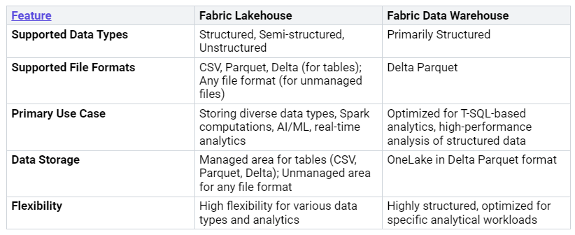 They handle data types differently. A Fabric Lakehouse is very flexible. It works with many data types. This includes structured data. It also handles semi-structured data. It can manage unstructured data. You can store any file type. This is in its unmanaged area. For tables, it uses CSV, Parquet, and Delta formats.