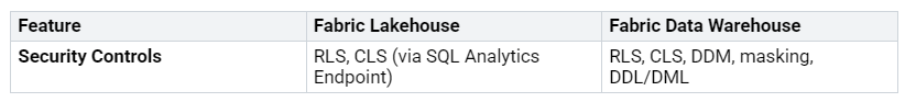 Row-Level Security (RLS): Both have RLS. This is for the Fabric Warehouse. It is also for the Lakehouse SQL endpoint. This lets you control rows. For example, a US analyst sees only US sales.