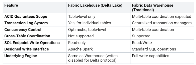But there is a key difference. Delta Lake’s ACID rules are for one table. This is not like old databases. They can change many tables at once. The Fabric Lakehouse SQL endpoint is read-only. This is for writing. SQL operations often use many tables. Delta Lake cannot promise ACID for many tables. This would not meet your needs. Apache Spark is the main tool. It writes to Lakehouse Delta tables. Spark works well with Delta Lake. It uses one-table transactions.