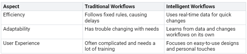 Knowing the differences between traditional and intelligent workflows can help you make smart choices for your business. Here’s a comparison of important parts: