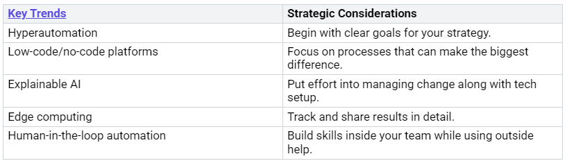 Keeping up with trends like hyperautomation and low-code platforms gets your business ready for future challenges and chances.