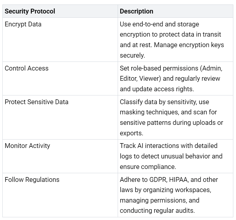 To keep things safe, set up rules for managing AI and use strict access controls. Check activities often and follow rules for compliance. This keeps sensitive data safe and builds trust in your AI automation.
