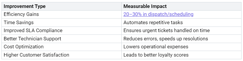 Also, AI-driven dispatching speeds up response times. It makes sure technicians are sent based on their skills and current conditions. This way, delays are reduced, and first-time fix rates go up. Here are some benefits of better dispatching: