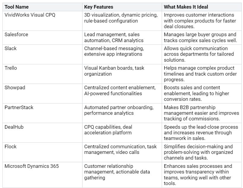 Collaboration tools help team members talk to each other easily. They close information gaps, save time, and boost productivity, which leads to better sales results.
