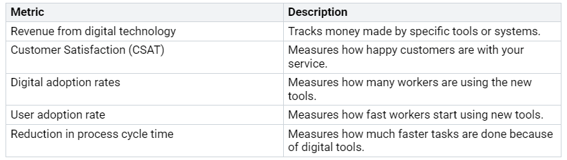 You should keep an eye on metrics like money made from digital tools, customer happiness, how many people use new tools, and how fast tasks are done. These metrics show how well your transformation is going.