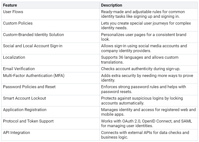 Azure AD B2C has many key features that help with managing customer identities and access. Here’s a summary of these features: