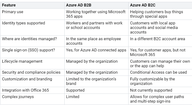 Here’s a list of the main differences between Azure AD B2B and Azure AD B2C: