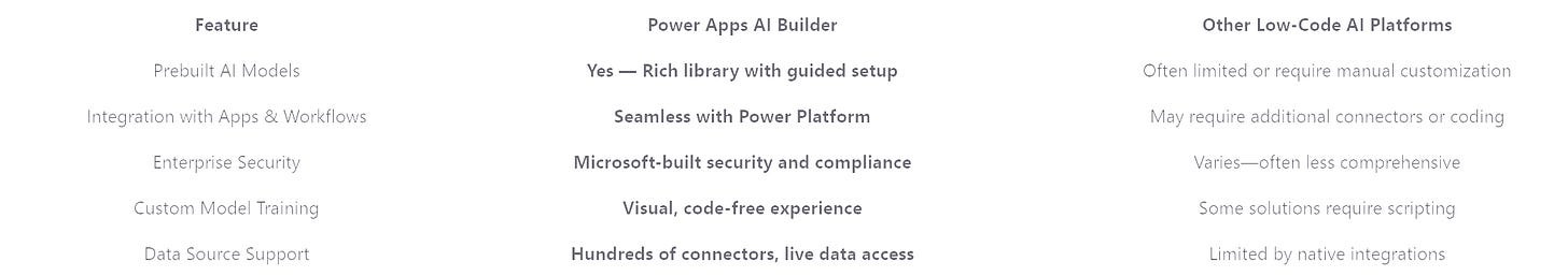 Here’s a comparison that distills the distinctive strengths of Power Apps AI Builder against other low-code AI solutions: