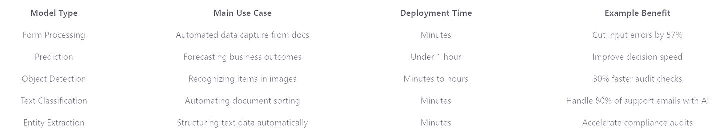 Intuitive Model Building: Prebuilt AI models for tasks like form processing, object detection, prediction, and text classification. Plus, the ability to create custom models tailored to business data with point-and-click guidance.