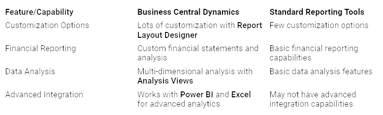 Making custom reports in Business Central is easy and powerful. You can use the Report Layout Designer to adjust your reports to your needs. Here’s how Business Central stacks up against regular reporting tools:
