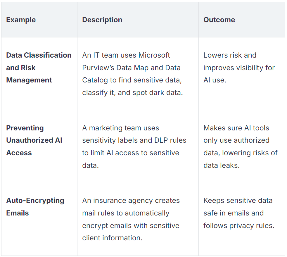 Many organizations have used Microsoft Purview's built-in protections to improve their data governance. Here are some examples: