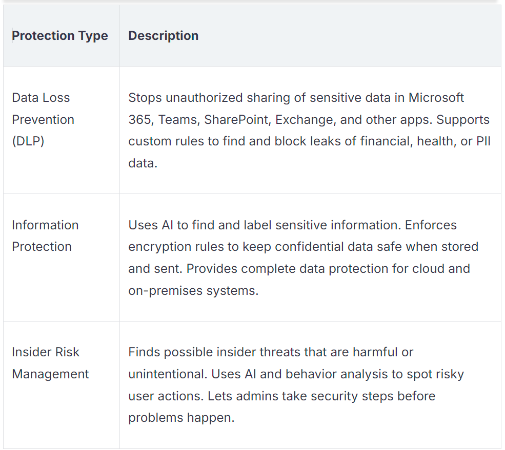Purview improves data security with built-in protections like Data Loss Prevention (DLP), Information Protection, and Insider Risk Management. These features help keep sensitive information safe and follow rules.