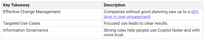 To get the most from Copilot, focus on managing changes, being ready with technology, and having good rules. Set clear goals and check how well you are doing. Use this AI tool to help your team reach its full potential.