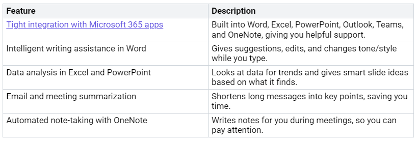 Microsoft 365 Copilot has many AI-powered features. These features make it different from other tools. They help you with daily tasks and boost your productivity. Here are some important abilities: