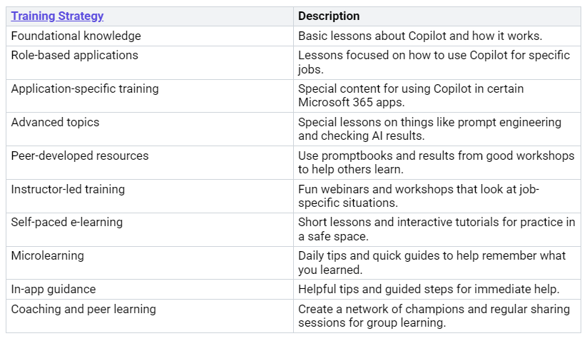 To use Microsoft 365 Copilot well, you need good training and support. These help users feel skilled and confident with the tool. Here are some helpful training ideas: