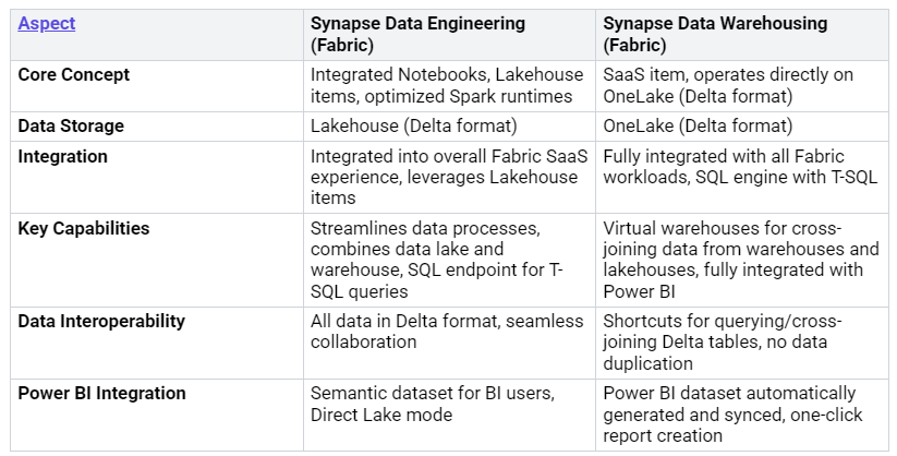 Synapse Data Engineering: This tool helps you manage data. It uses notebooks. It uses Lakehouse items. It has fast Spark runtimes. Lakehouse mixes data lake and data warehouse features. It stores data in Delta Lake format. This helps data experts use it. It also has a SQL endpoint. This lets you use T-SQL queries. You can use views and functions. Lakehouse takes in data. It uses dataflows and pipelines. It uses shortcuts. This makes virtual folders. It makes virtual tables. You do not copy data. All data in Microsoft Fabric saves in Delta format. This helps data experts work together.