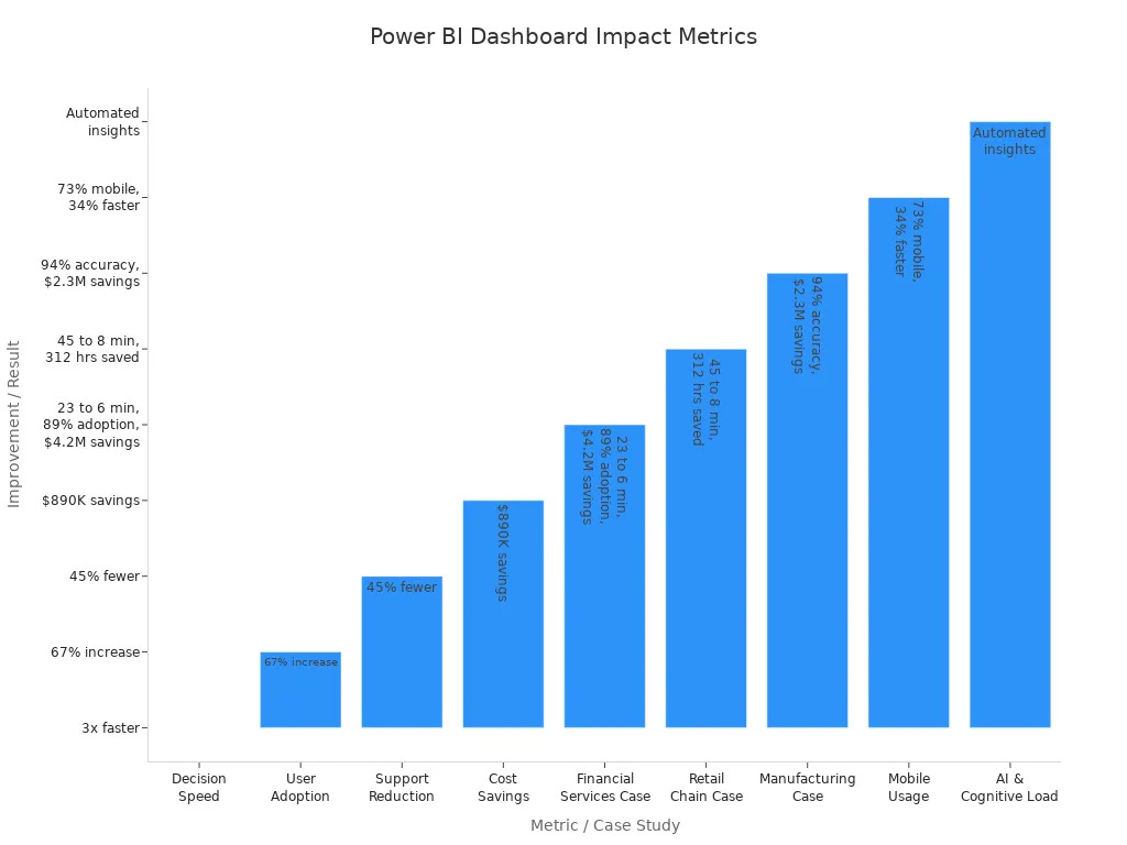 You need quick answers to business questions. Power BI Dashboards show your main numbers on one page. Leaders and teams see important data right away. This helps you make smart choices faster. Studies say decisions happen three times faster. Mobile layouts help 73% of leaders use dashboards easily.
